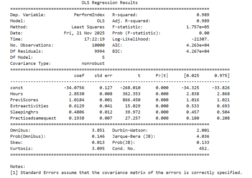 R-Squared   : 0.989    Interpretation: 98.9%  of changes of target variable PerformIndex is explained by the features. It is a good sign. that the model produced under OLS is good
