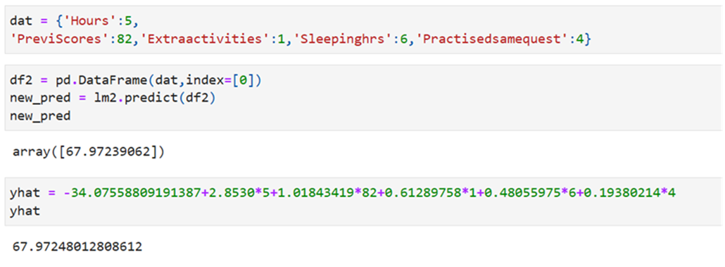 • PerformIndex Predicted =  – 34.0756 +2.8530*Hours                                                  +1.0180*PreviScores+0.6129*Extraactivities+0.4806*Sleepinghrs+0.1938*Practisedsamequest