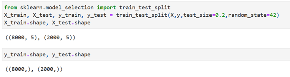• Out of 10000 records 8000 records as X_train and y_train and 2000 records as X_test and y_test by specifying the argument  test_size as 20%